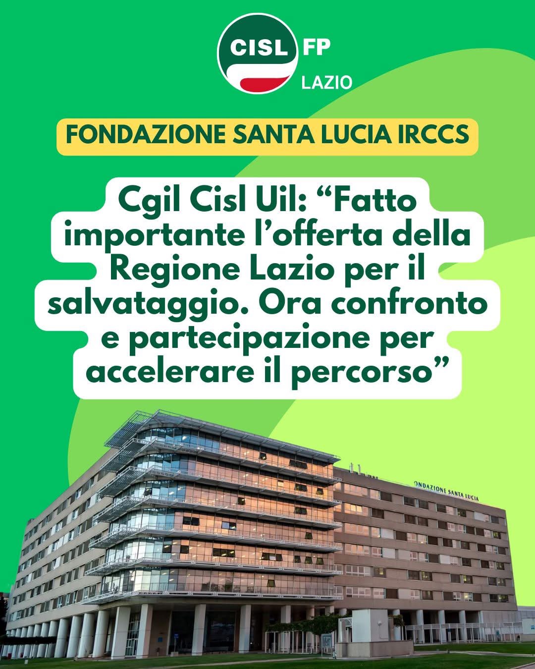 FONDAZIONE SANTA LUCIA. CGIL CISL UIL: FATTO IMPORTANTE ACCELERARE IL PERCORSO